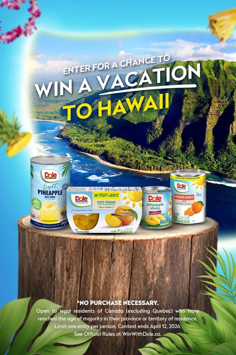 To enter, purchase any Dole branded product from a retail store in Canada during the Contest Period and upload a photo of your receipt at WinWithDole.ca. No purchase is necessary. You may also enter using the alternate entry method described in the Official Rules.